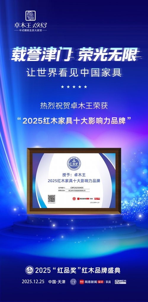 从传统家具制作到开创红木整装先河,卓木王完成了行业从0到1的突破;从构建“六位一体”全案服务体系,到打造“3000方宫廷风传世祖宅”这样的时代标杆,卓木王将红木整装从空间营造提升至文化建构的高度;从发起制定《中式红木整装标准趋势报告》,到持续推动行业标准化进程,卓木王始终以“定义者”的姿态,引领行业从产品交付向价值共生跃迁。