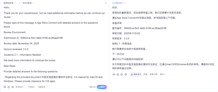 现在苹果要求我们“请提供iOS应用的审核通过证明”,我们一开始就是做App的,医药局回复不对手机App进行医疗器械注册,才做成电脑软件的,为了苹果我们还特意做了macOS版本。