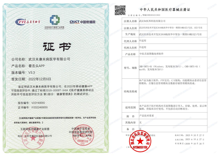 注册过程的磨人程度,远超想象。从2023年8月开始准备注册材料,到2025年11月拿到证书,整整耗时两年多。软件检测就在辽宁搞N个来回,武汉又补检了些许项目,第一回专家评审就被直接打回,期间至少经历了十几次资料补正,甚至标点符号没对齐、格式不规范都会被驳回。我们一遍遍跟专家沟通,在指导下反复修改,终于拿到了《中医舌面图像处理软件注册证》。