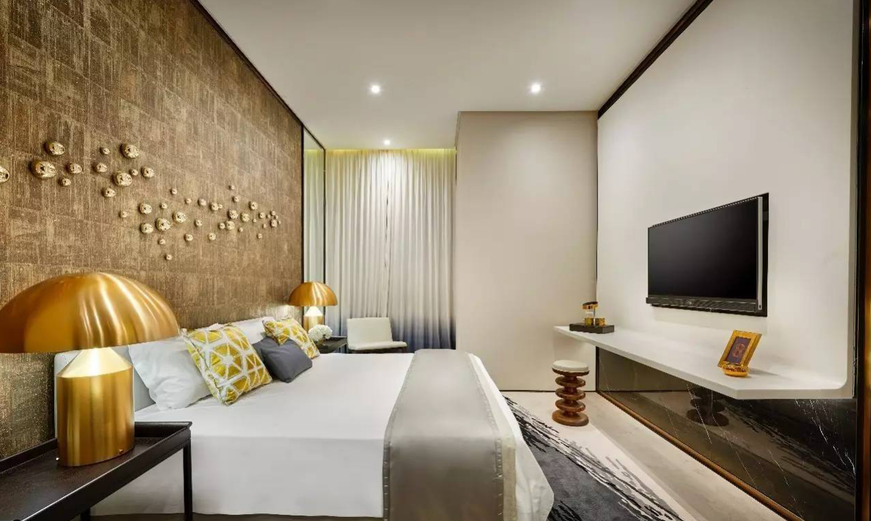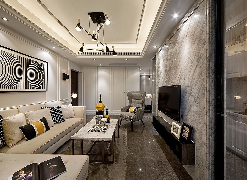当思考有形元素如何与无形的回忆、故事更好结合时,生活与艺术便开始邂逅。此时,都市的情调与氛围已然定下。色彩层次分明,用光强化踢脚线,清晰展现出客餐厅与过道的内在联系。转折体块融入镂空形态,与素雅温润的质感碰撞出诗意。过道末端的画作与电视侧旁的摆件,共同彰显艺术格调,让自由的互动体验与审美愉悦无限延伸。