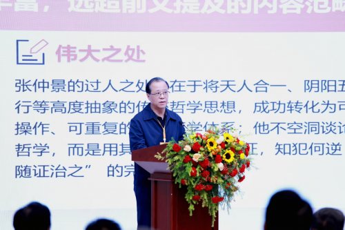 中国社会科学院原秘书长赵奇发表《张仲景医学蕴含的传统哲学思想》的主旨演讲;赵秘书长指出:张仲景的医学是传统哲学思想在生命科学领域的一座不朽丰碑,具有深入研究的重要价值。通过对张仲景医学蕴含的传统哲学思想的深入研究,有助于我们更好地把握其医学理论和实践的本质。现实意义就是发扬光大,发扬中医的宝贵财富,跟上时代发展步伐,让中医焕发出新的活力。历史意义就是继往开来,继承祖国医学的优良传统,不忘初心,开创末来,让中医显示出越来越重要的作用。