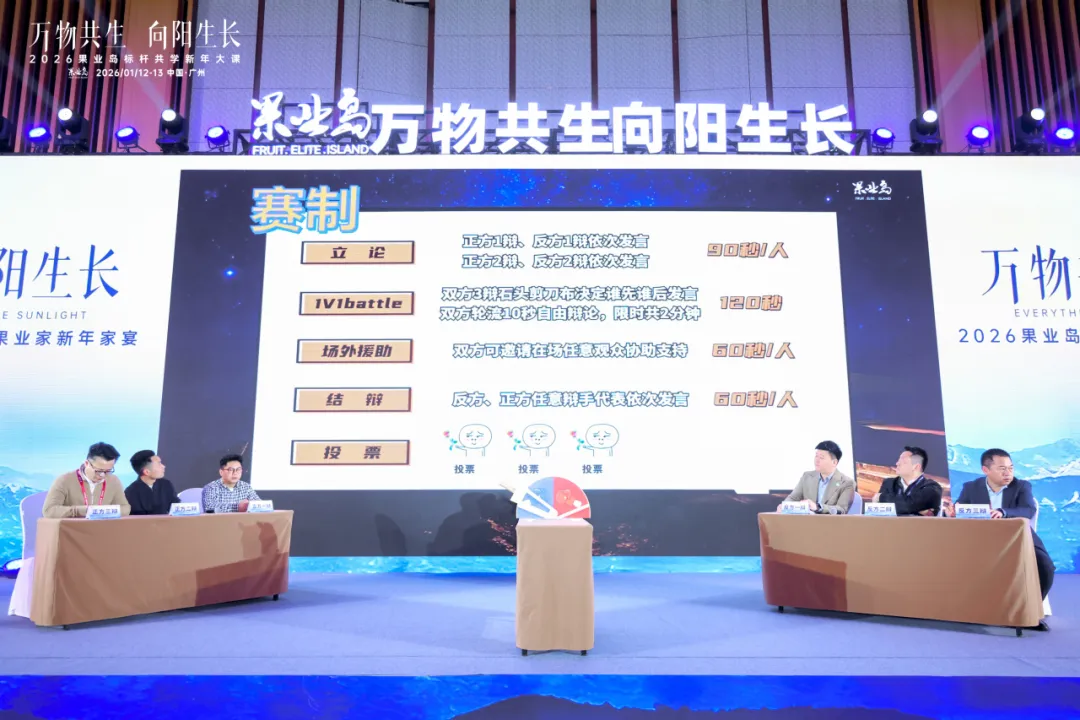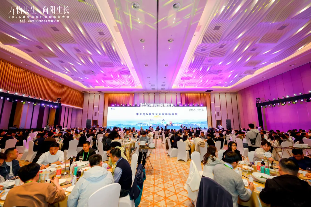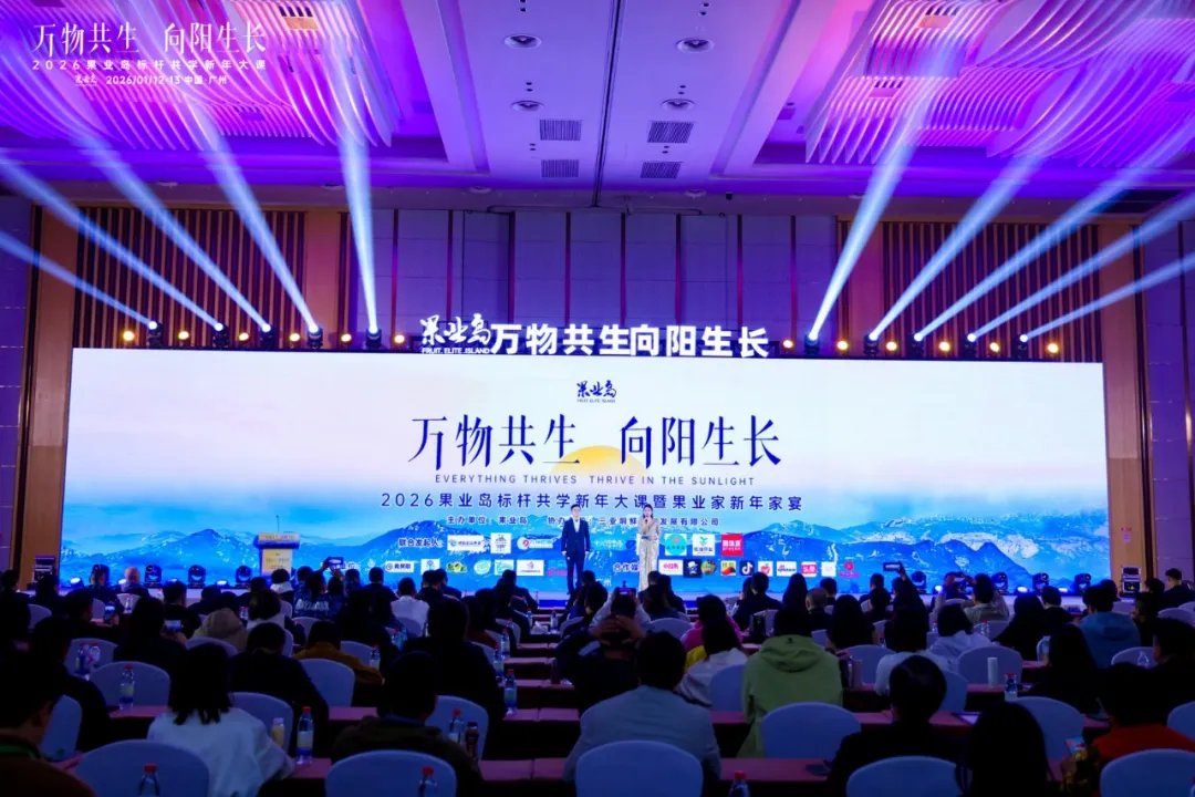 2026年1月12-13日,以“万物共生,向阳生长”为主题的果业岛标杆共学新年大课暨果业家新年家宴在广州黄埔君澜酒店隆重举办。活动汇聚来自全国的500余位果业龙头企业家、行业专家、跨界领袖及产业链核心代表,在岁末年初之际进行了一场深度思想碰撞与战略校准。